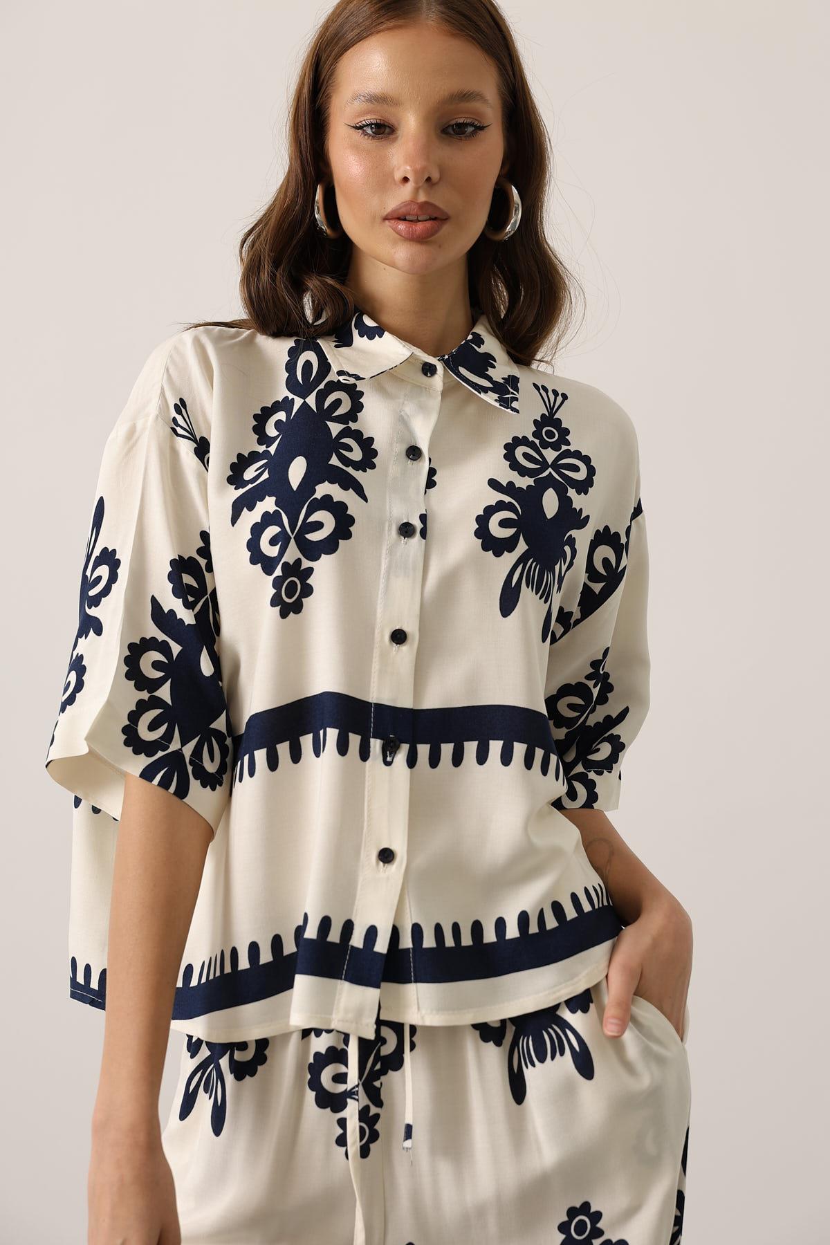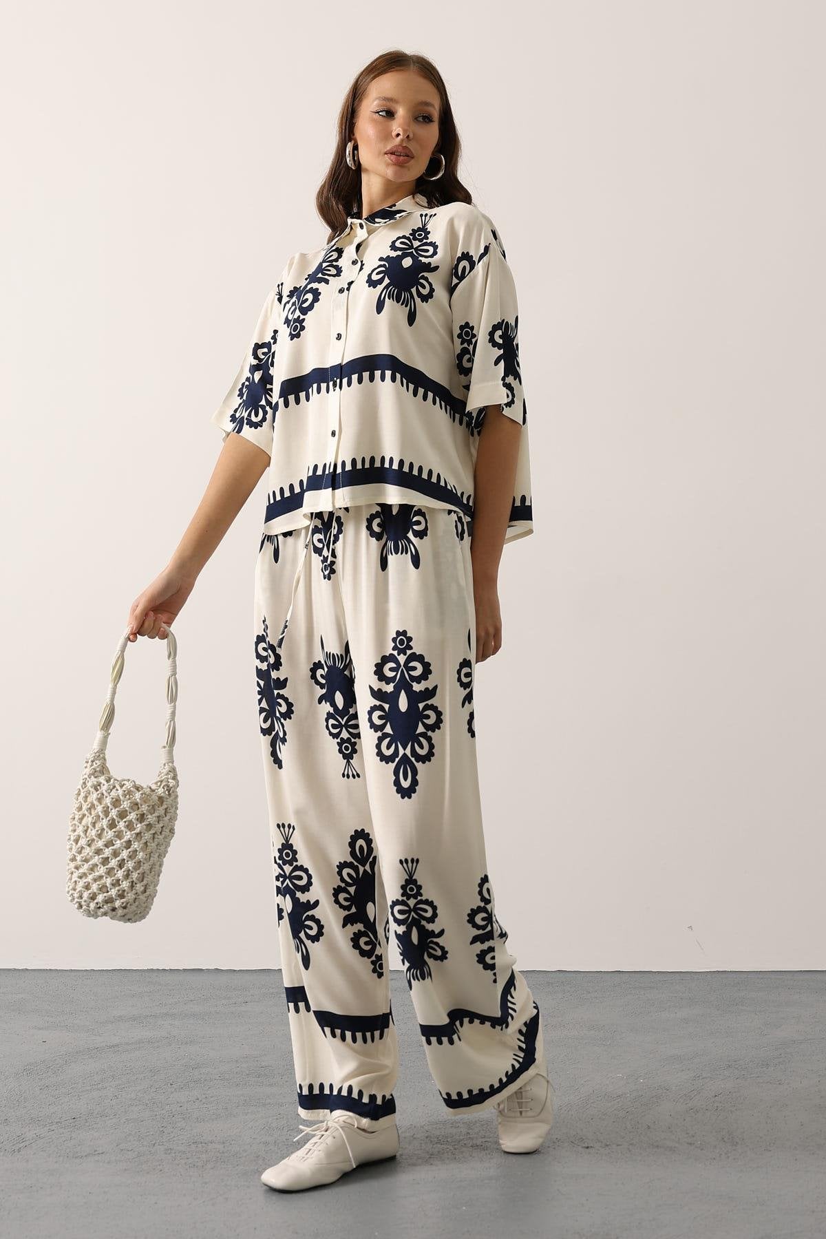 Stylish blue two-piece set with elegant floral pattern